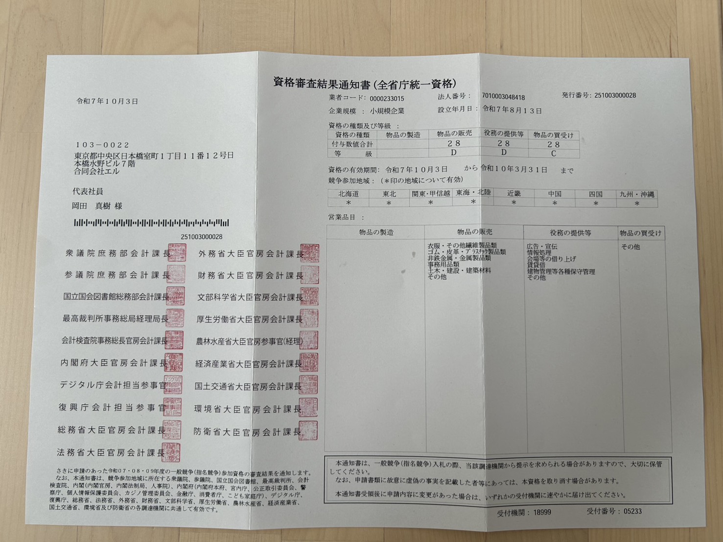 このたび、合同会社エルは 「全省庁統一資格」 を正式に取得いたしました。